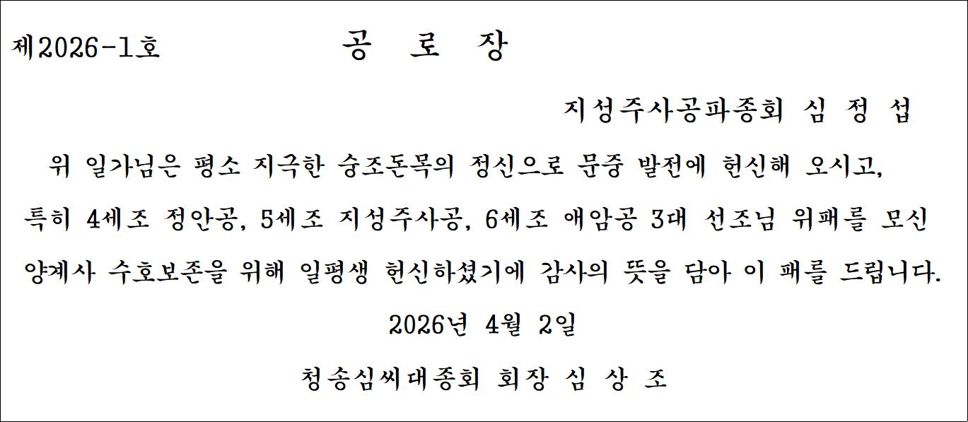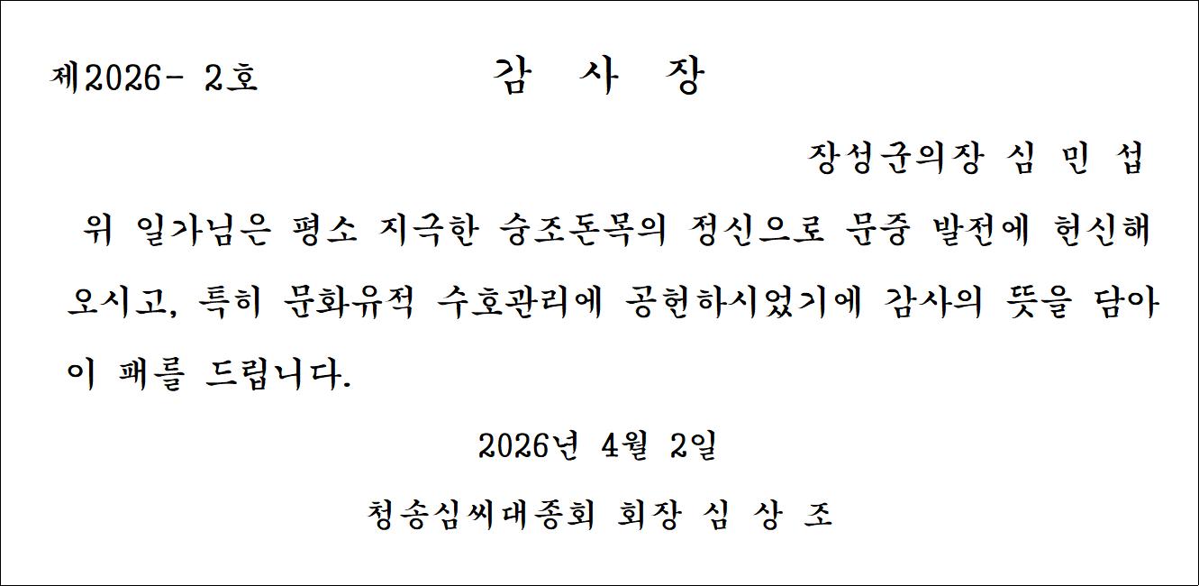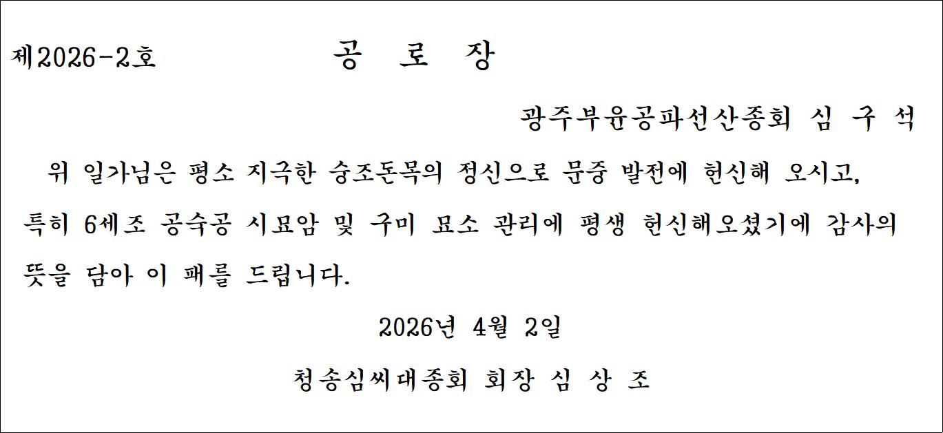 | 수상자 아드님 심충현 광주부윤공파선산종회 총무이사 대리수상 |